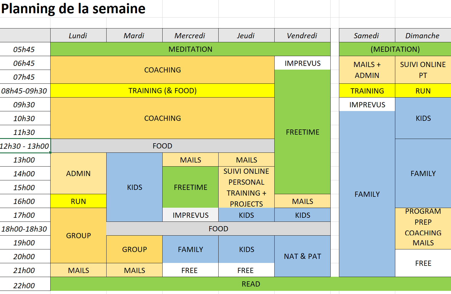 Ce planning joint les obligations professionnelles et privées ainsi que le temps pour prendre soin de soi-même. N'oublie pas un planning n'est jamais immuable, tu peux toujours l'adapter à la situation actuelle. Et le plus important est bien sûr, que ton planning personnel fonctionne pour toi et que tu es content avec !